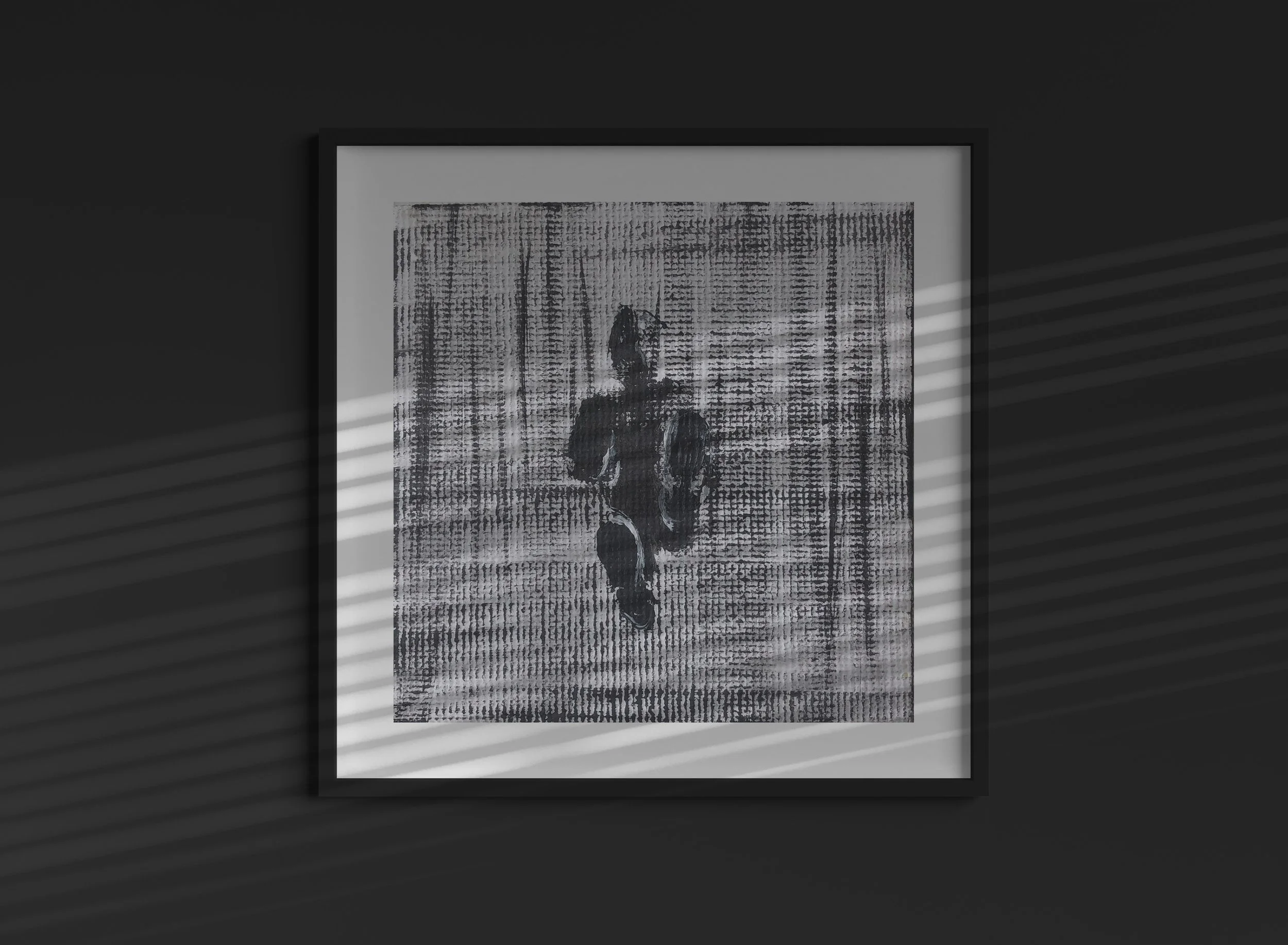 The subject appears through the stark lines of a metal grill, distorted yet unmistakably human. The piece studies how perspective shifts our sense of connection