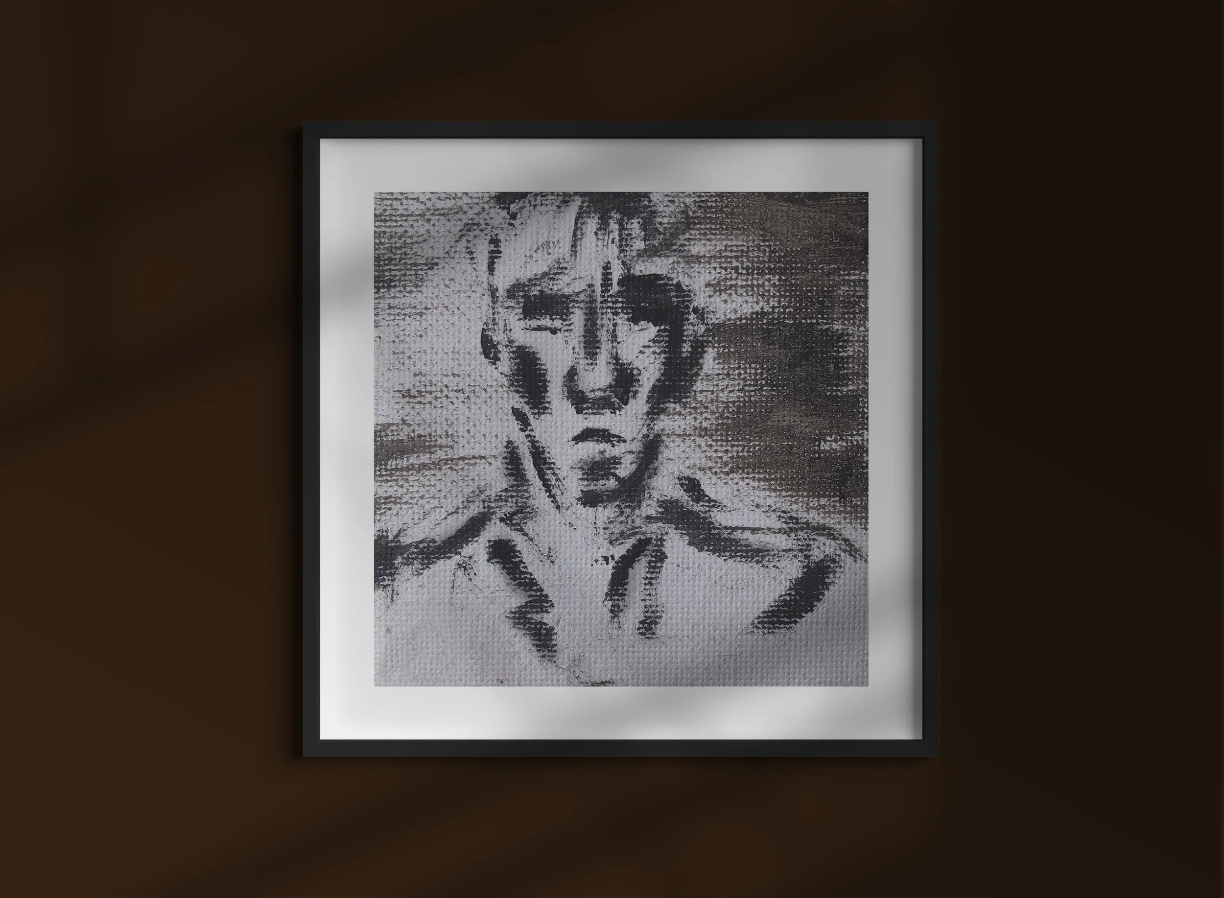 A textured portrait of a man in quiet tension. The cool palette and stark lines echo an unspoken pull—an intimate pause between him and the unseen viewer.