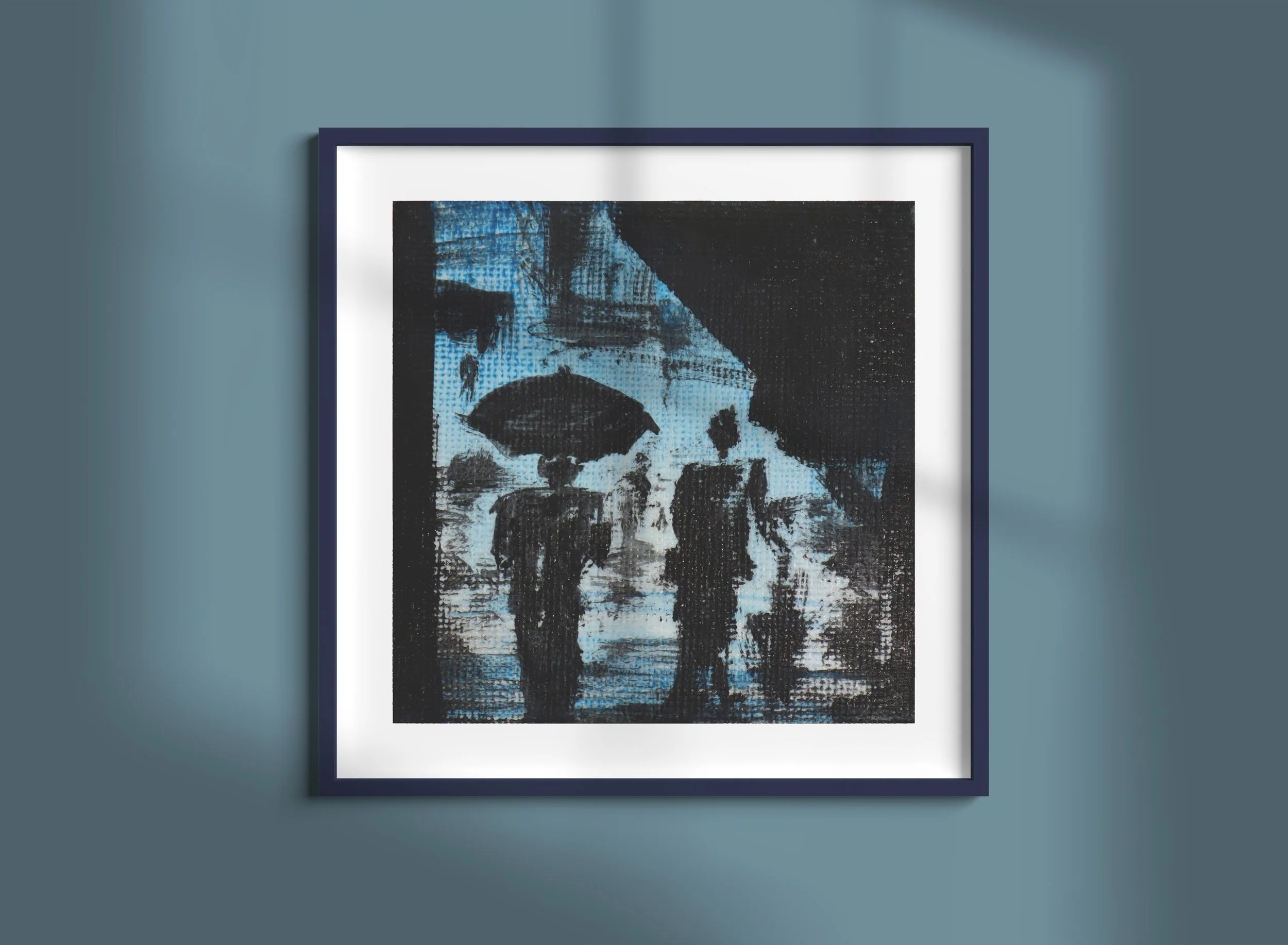 Figures move through a rain-soaked street, umbrellas crossing paths without connection. Though the space is shared, each person remains enclosed within their own rhythm and thoughts