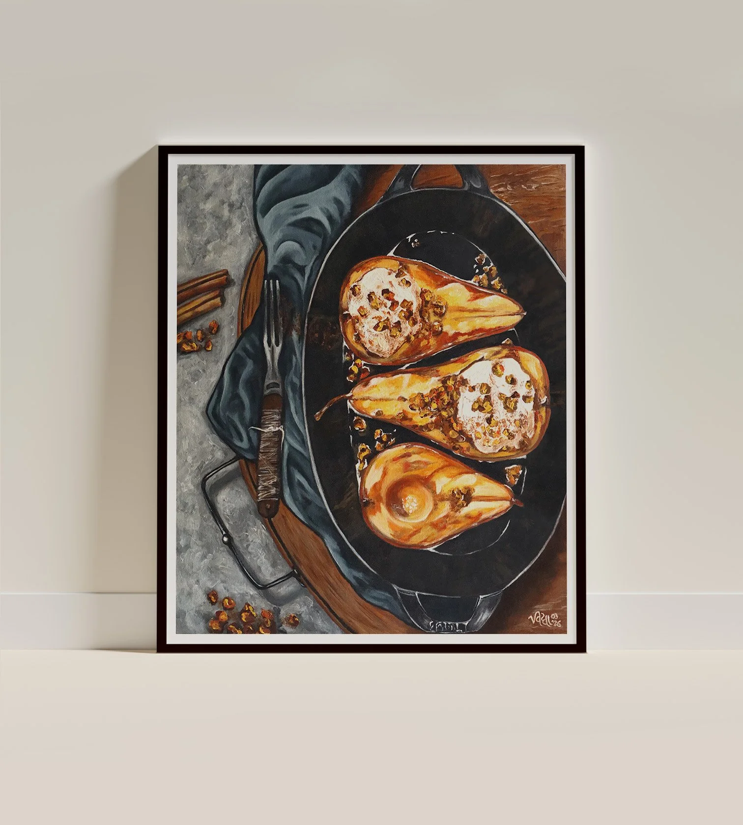 This painting continues my ongoing exploration of pears as a central subject within the series, shifting the setting from their natural state into a more intimate culinary environment. While earlier works in the series present pears in their raw, freshly gathered form, this piece reflects a later stage in that journey—where the fruit becomes part of a prepared dish.